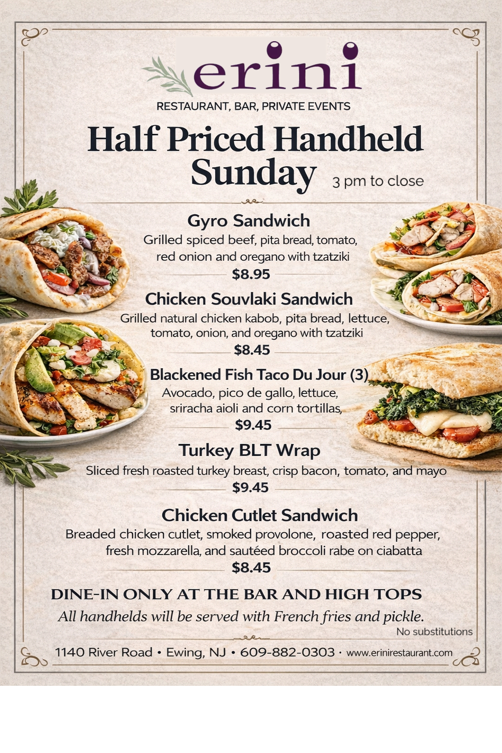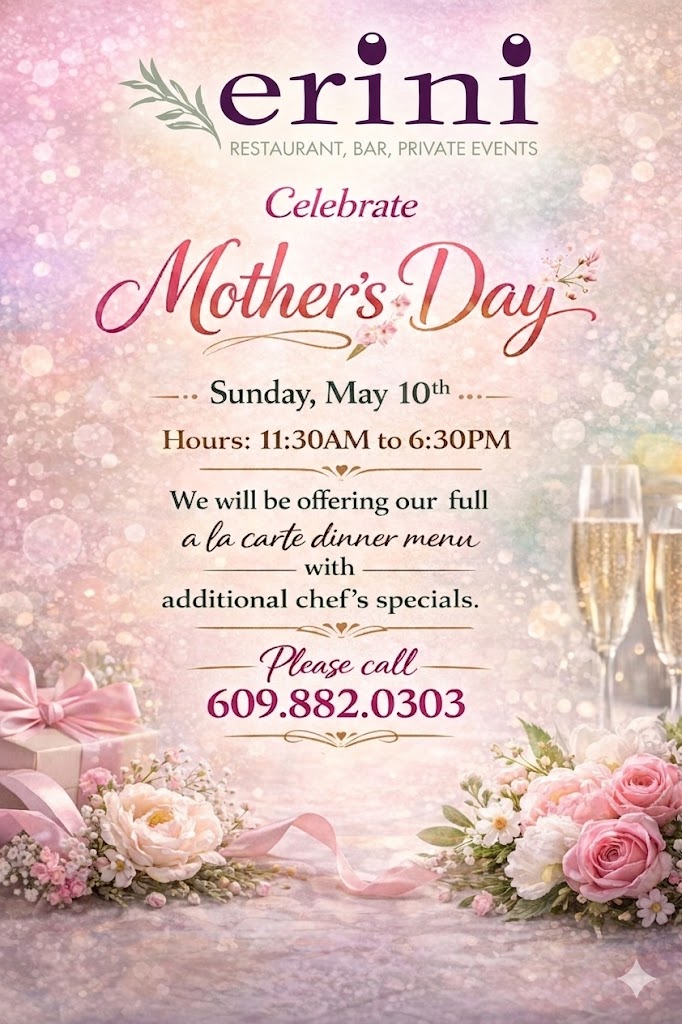 Erini Restaurant is closed on Christmas Day, New Year’s Day, Memorial Day, Labor Day, Fourth of July and on Black Friday. We apologize for any inconvenience.